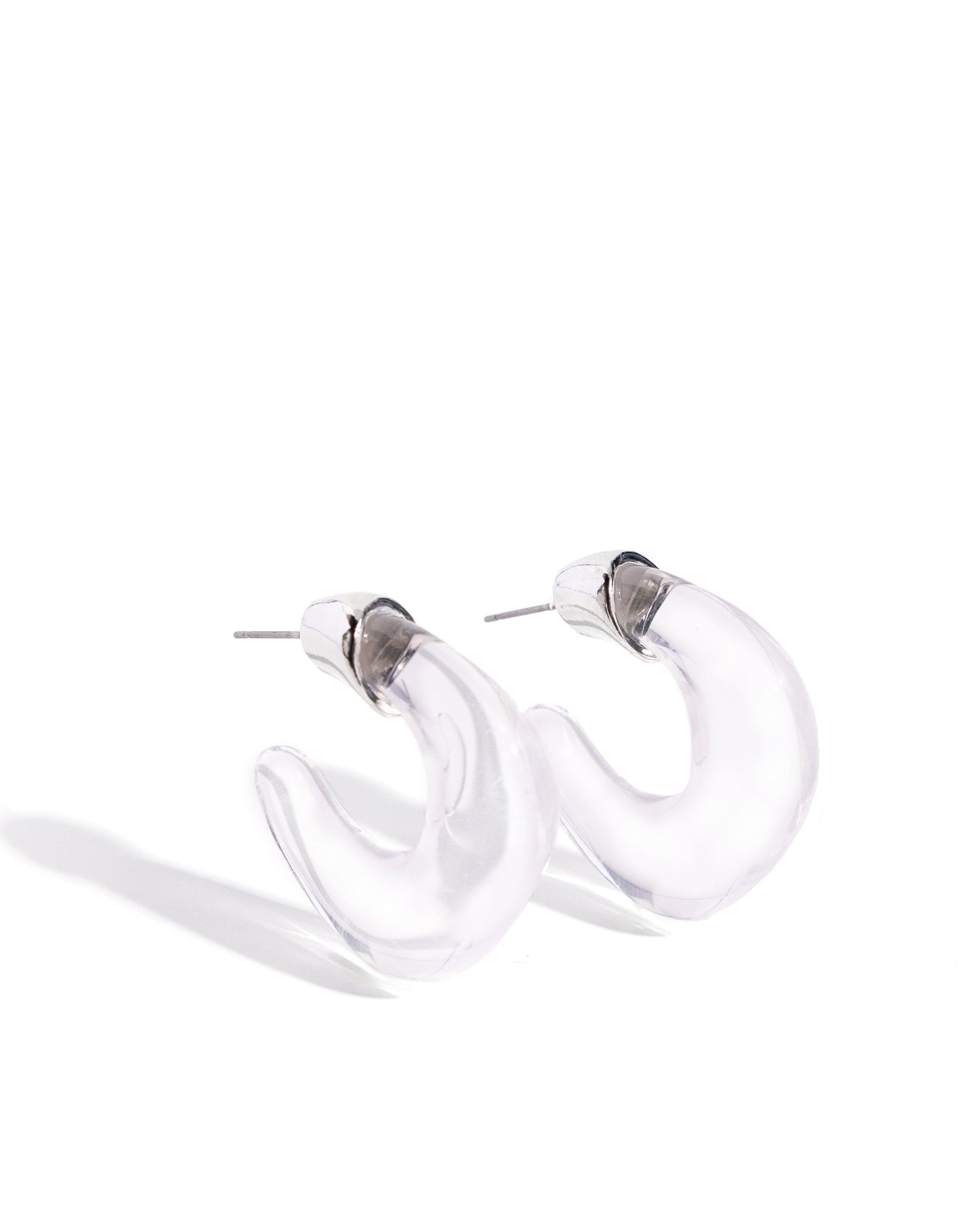 Connected to a silver cap fitting, a transparent, abstract white hoop curls around the ear for a chic clear look. Earring attaches to a standard post fitting. Hoop measures approximately 1" in diameter.