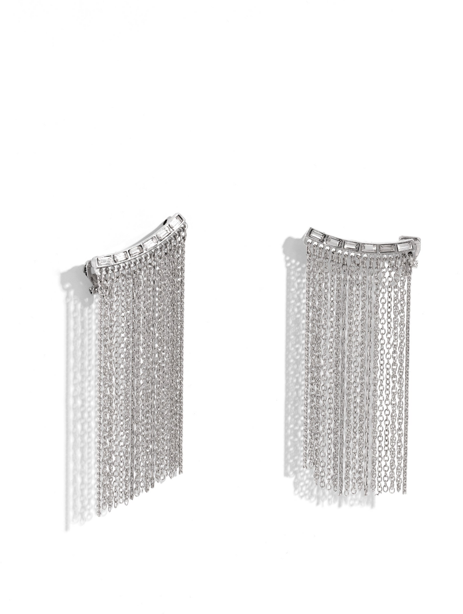 A tapered fringe of mismatched dainty silver chains cascades from the edge of a curving white emerald-cut gem-encrusted frame, creating an edgy centerpiece atop the ear. Features an extended post fitting that climbs the back of the ear and can be pressed together for a more secure fit.