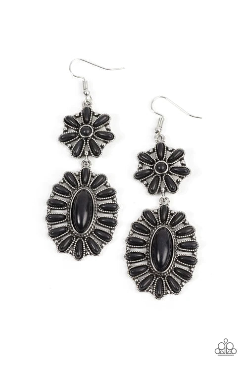 Dainty black stones are pressed into studded silver fittings, coalescing into two frames that delicately link into an earthy floral lure. Earring attaches to a standard fishhook fitting.