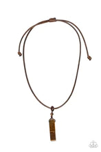 A rectangular tiger's eye stone pendulum is knotted in place below a dainty tiger's eye stone bead that glides along a shiny brown cord below the collar, resulting in an earthy pendant. Features an adjustable sliding knot closure.