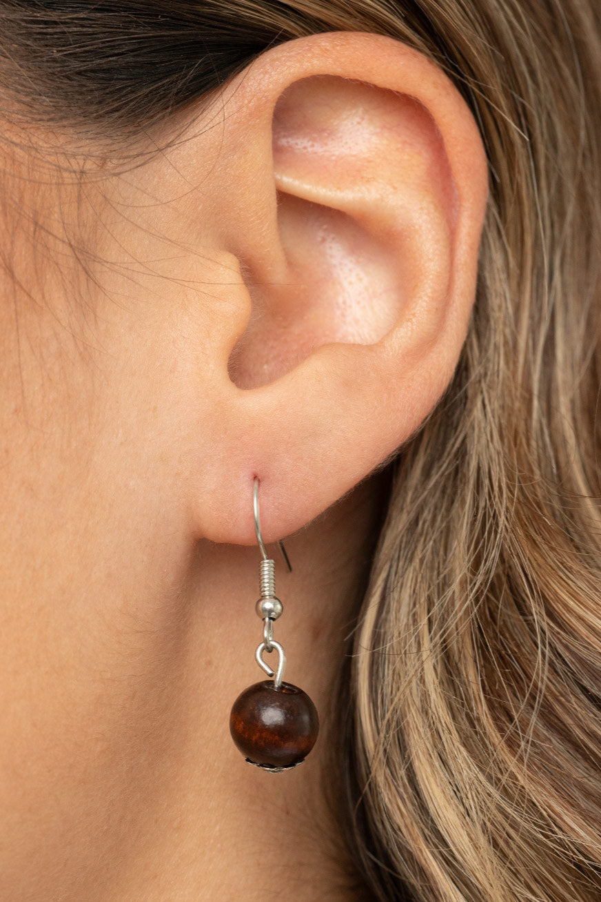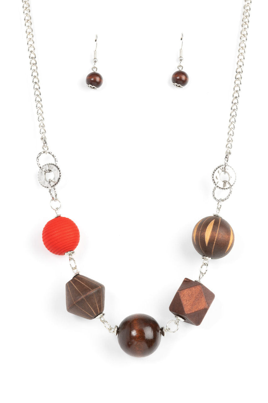 Infused with a solitaire red wooden bead, a mismatched assortment of studded silver hoops, textured silver rings, and oversized brown wooden beads delicately connect across the chest for a stylishly handcrafted fashion. Features an adjustable clasp closure.