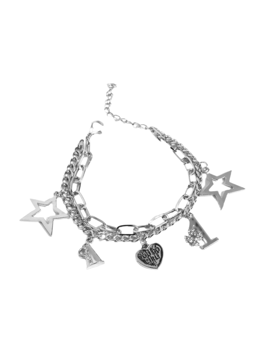 A collection of sporty-inspired silver charms, including stars, a white rhinestone-lined cheer megaphone, a white rhinestone-dusted "#1," and a heart inscribed with the inspirational phrase "You Go Girl!", dangle from layered silver curb and paperclip chains, creating playful spirit along the wrist. Features an adjustable clasp closure.