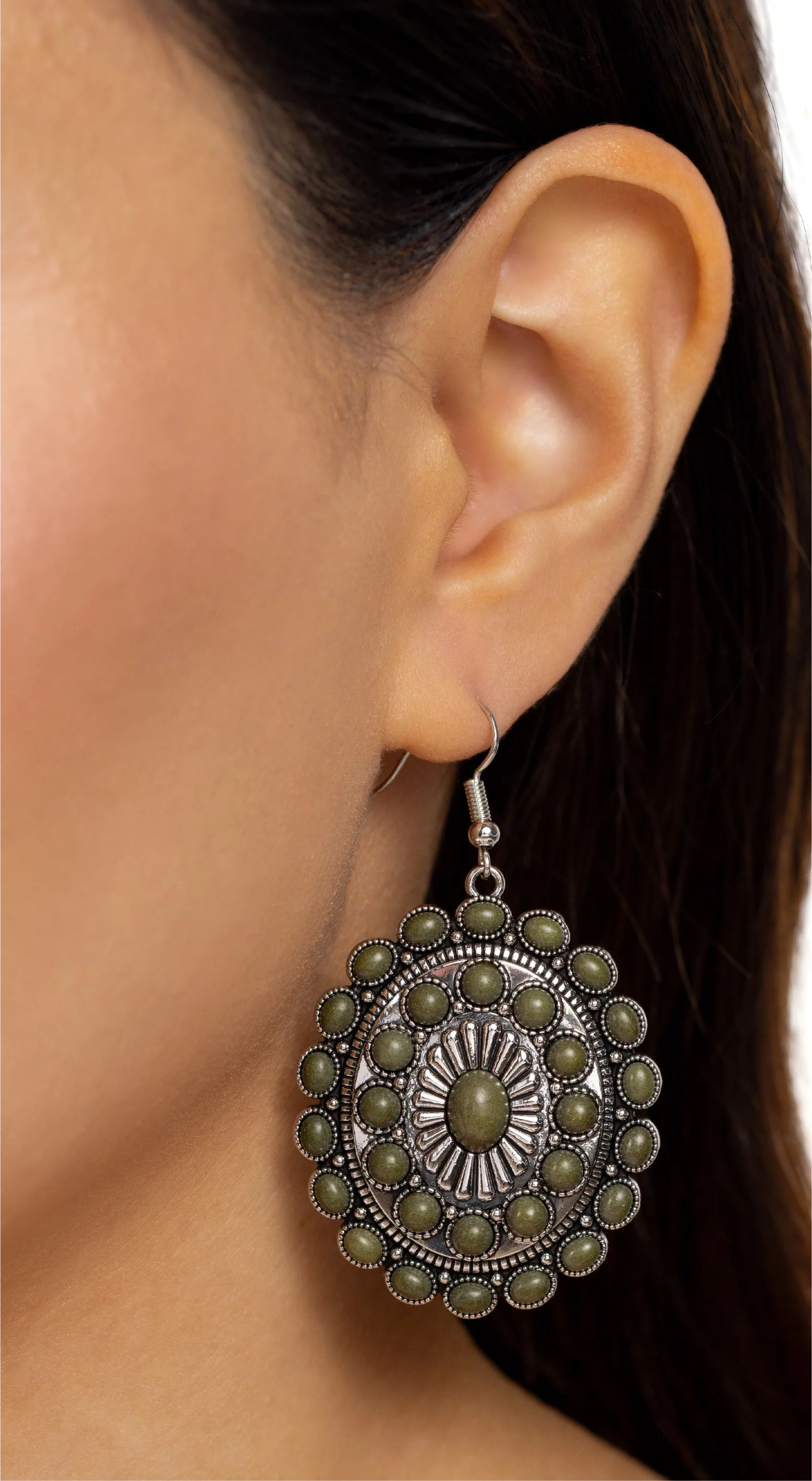 Earthy Olive Branch stones ripple out across a stacked silver frame radiating with studded and linear silver texture, resulting in a rustic floral centerpiece. Earring attaches to a standard fishhook fitting.