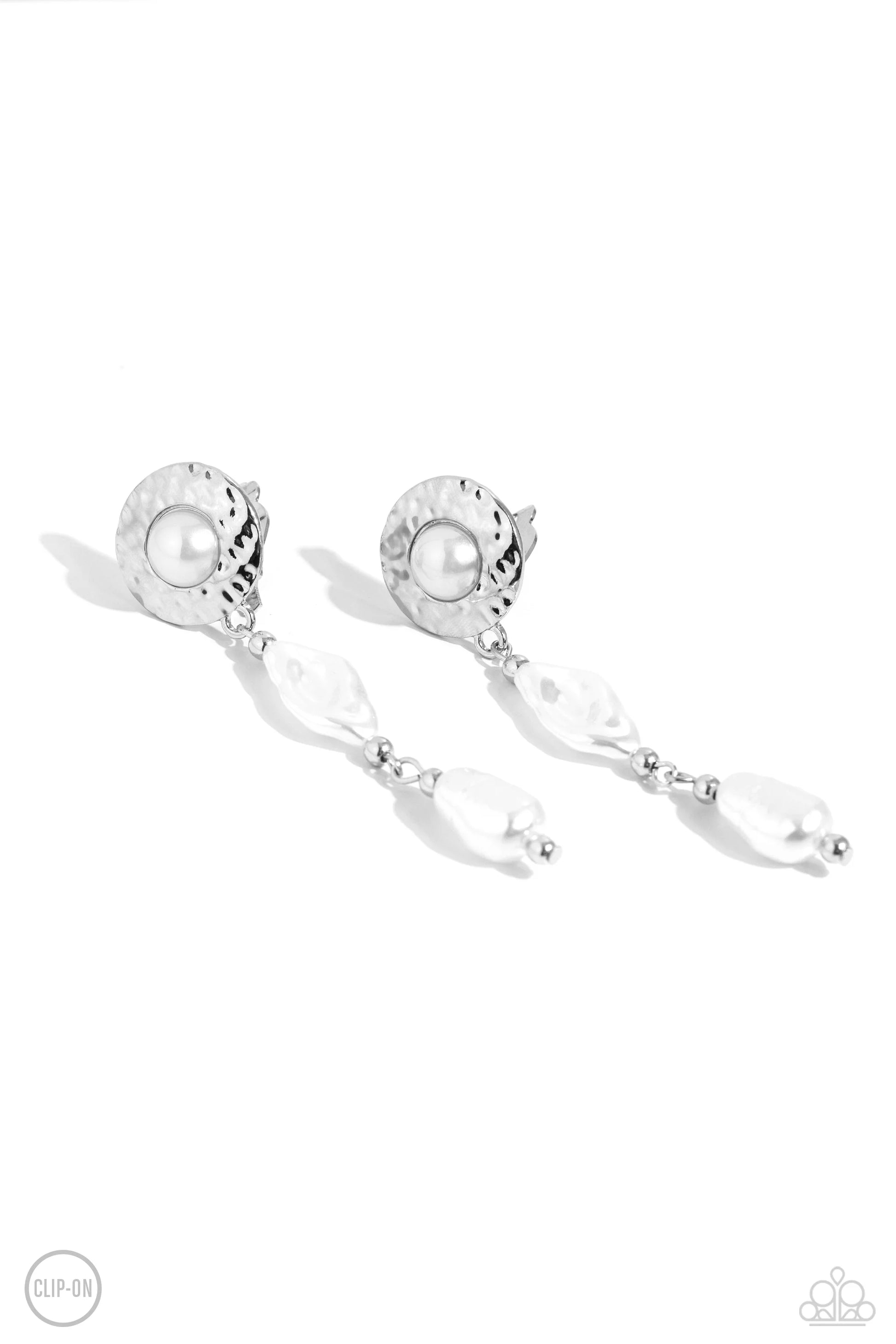 Featuring an iridescent sheen, a glossy pearl dots the center of a hammered silver frame, rippling in tactile texture. Featuring imperfect finishes, a bubbly tassel of baroque white pearls and silver beads trickles from the bottom of the radiating frame for a touch of refinement. Earring attaches to a standard clip-on fitting. Due to its prismatic palette, color may vary.
