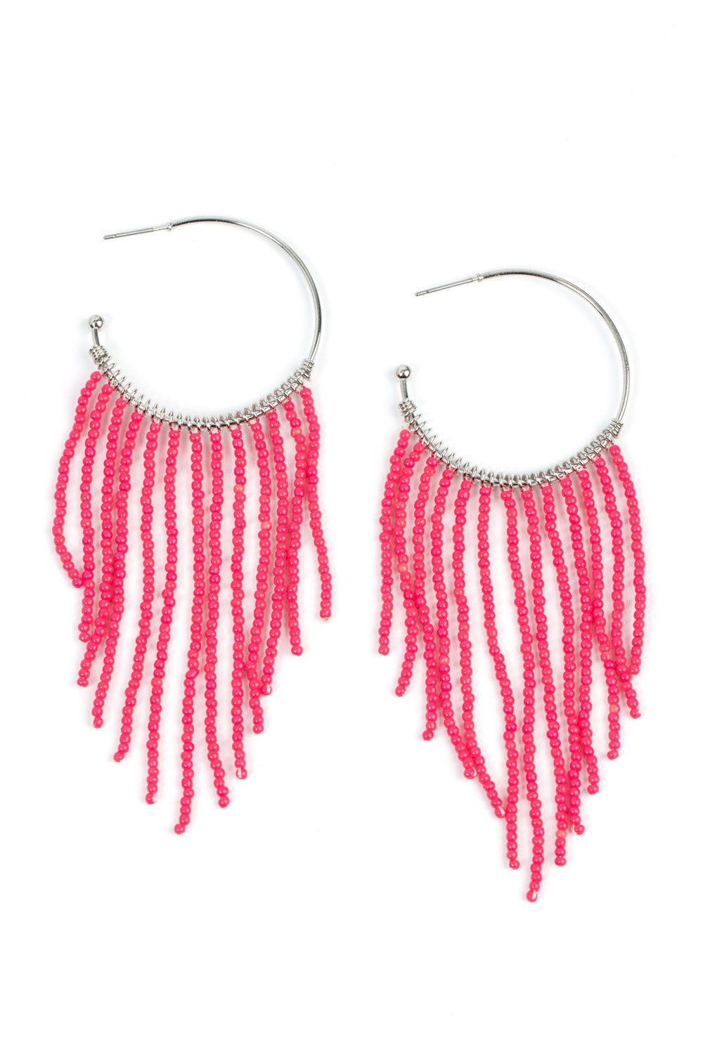 Strands of dainty pink seed beads stream out from the bottom of a classic silver hoop, resulting in a flirtatiously tasseled look. Earring attaches to a standard post fitting. Hoop measures approximately 1 1/2" in diameter.