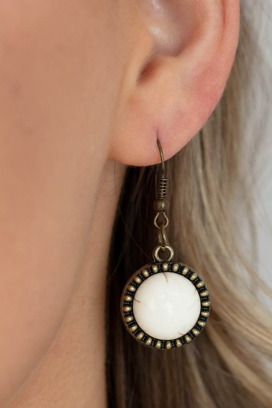 Earthy white stones, pressed into round antiqued brass frames featuring dot and interlinking loop motifs, create a dramatically rustic statement as they link across the collar. Features an adjustable clasp closure.