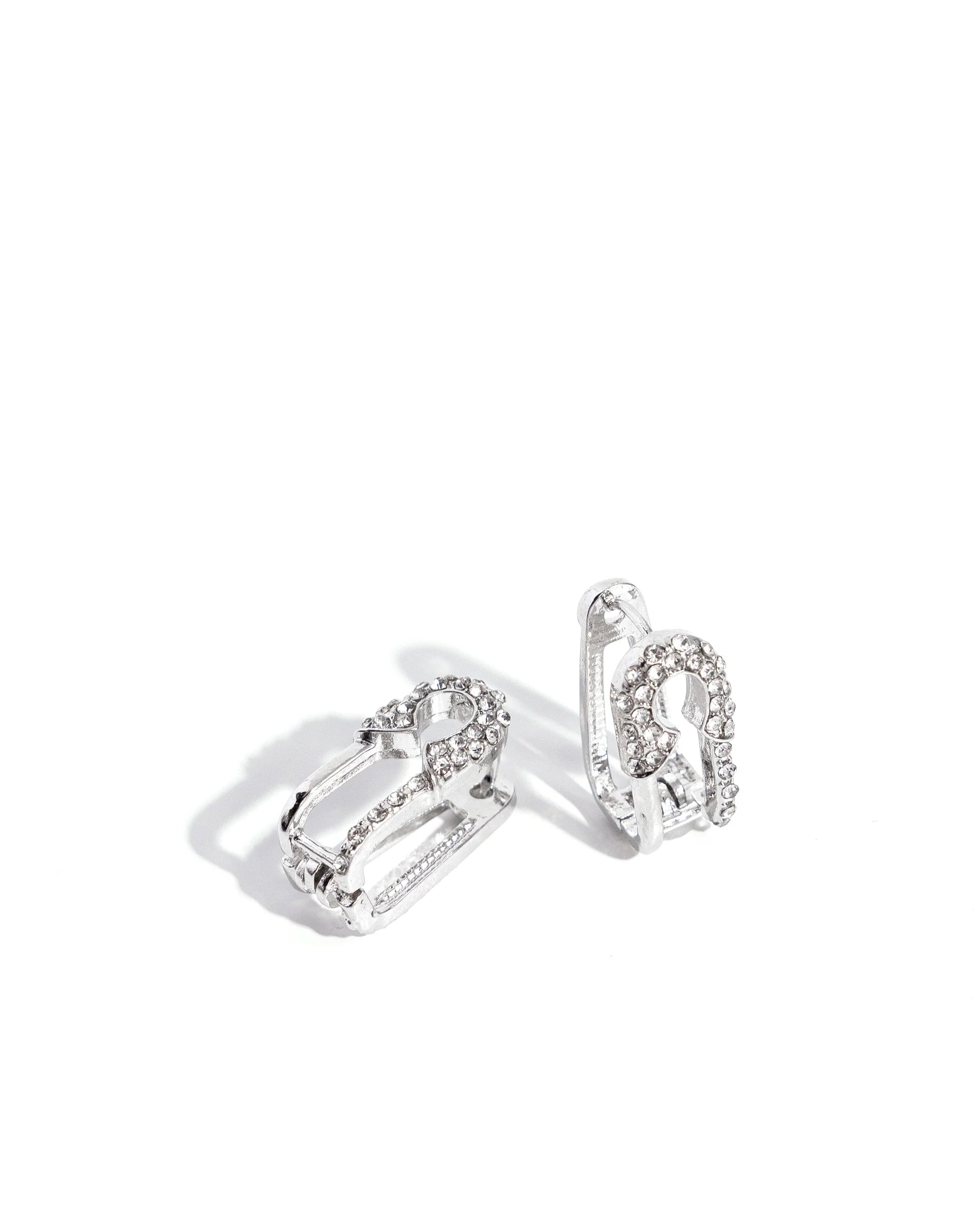 A white rhinestone-embellished silver safety pin curls along the curvature of the ear, creating a surprising hint of edgy elegance. Earring attaches to a standard hinge closure fitting. Hoop measures approximately 1" in diameter.