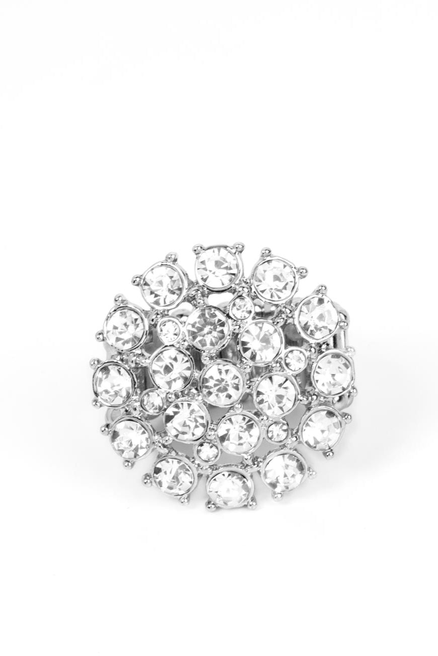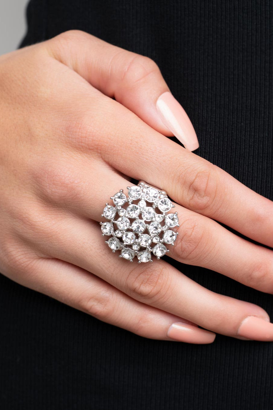 Featuring pronged silver fittings, an explosion of glassy white rhinestones sparkles atop the finger for a statement-making fashion. Features a stretchy band for a flexible fit.