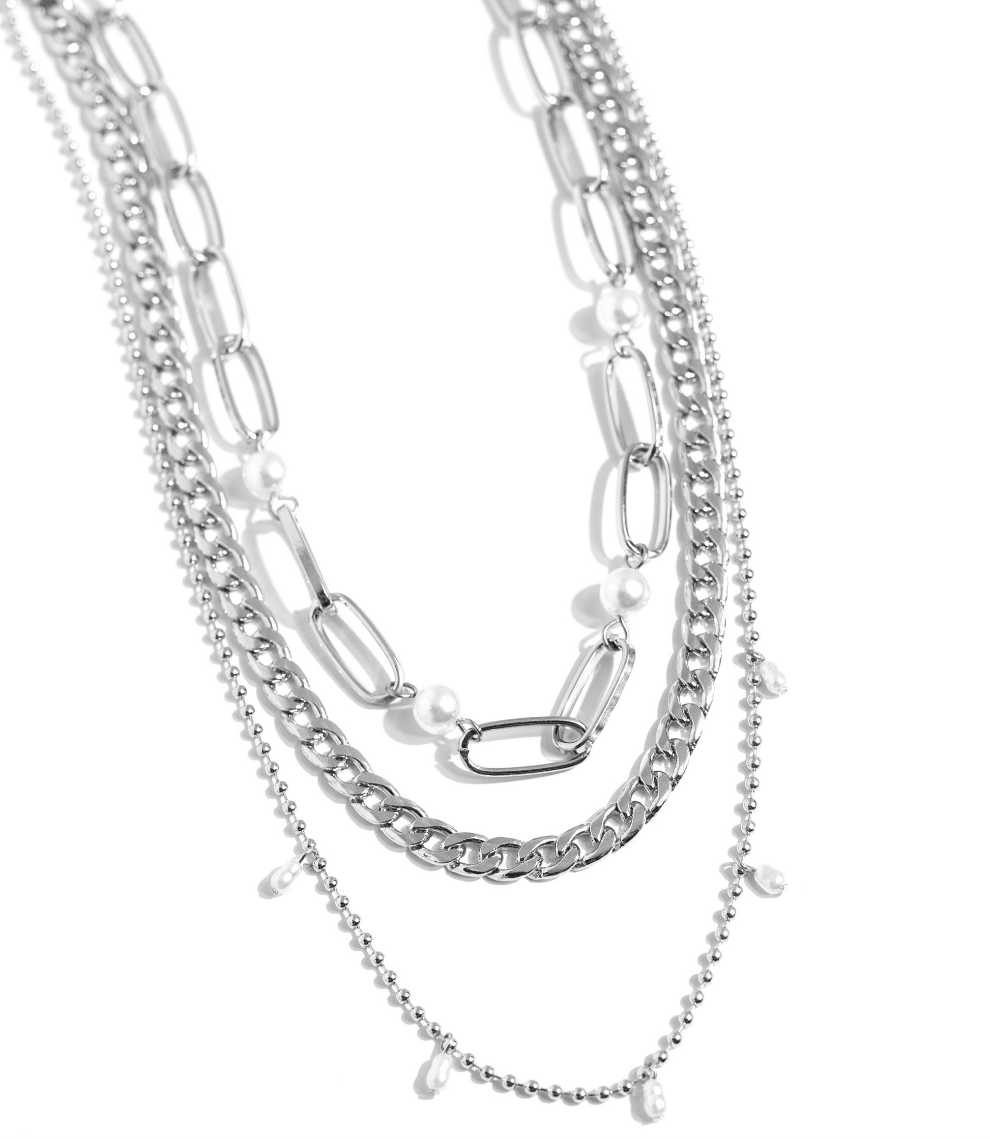 Three mismatched silver chains cascade in various lengths across the chest creating a radiantly edgy display. The uppermost chain is accented with glossy white pearls that sporadically interrupt the silver paperclip chain while a collection of dainty white baroque pearls glide along the lowermost beaded silver strand, creating a layered, glossy display. Features an adjustable clasp closure.