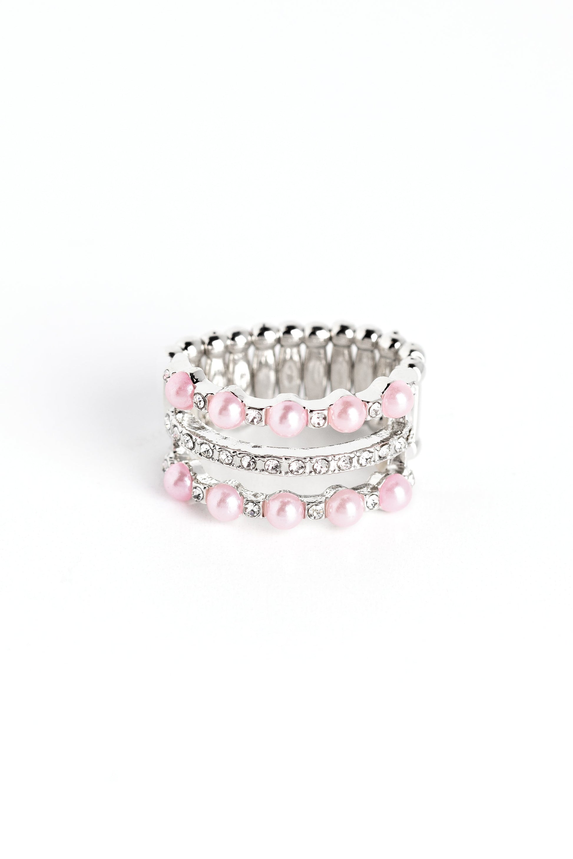 Dainty, bubbly baby pink pearls and glittery white rhinestones are sprinkled across three airy silver bands, creating a refined centerpiece. The centermost band features rhinestones only, drawing the eye to its subtle sparkle. Features a stretchy band for a flexible fit.