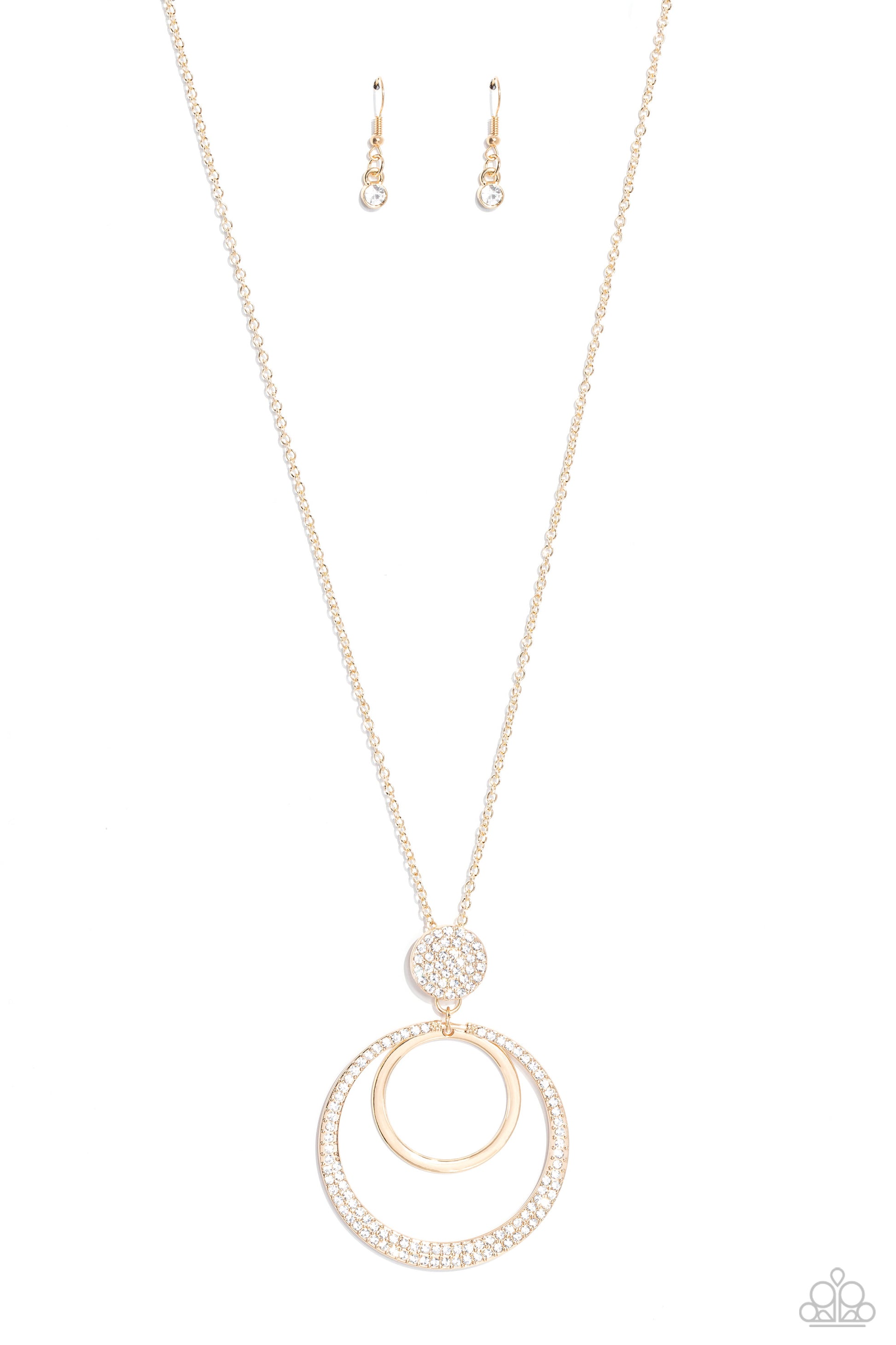 Two rings, one a high-sheen gold, the other, an oversized warped ring embossed with dainty white rhinestones, swing from the bottom of a glistening gold pendant embossed with rhinestones in the same hue, creating a sparkly, stacked pendant. The glittery display falls from an elongated, classic gold chain, lengthening the torso. Features an adjustable clasp closure.